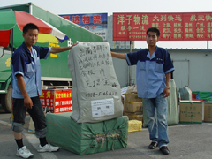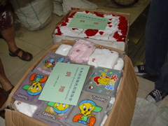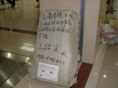 2008年6月、中国児童少年基金会「春蕾計画」事務局の王徳林氏を通じ、私たちは「ボールペン300本及び綿の靴下大小」が必要とされているという情報を得ました。その後6月21日に、王徳林氏同行のもと北京市内永安門の卸売市場にて支援物資を購入。即時、雲南省の麗江民族孤児学校に向け、物資を発送しました。